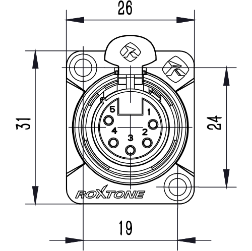 5 pole XLR female socket, Black electrophoretic paint shell, Gold plated contacts