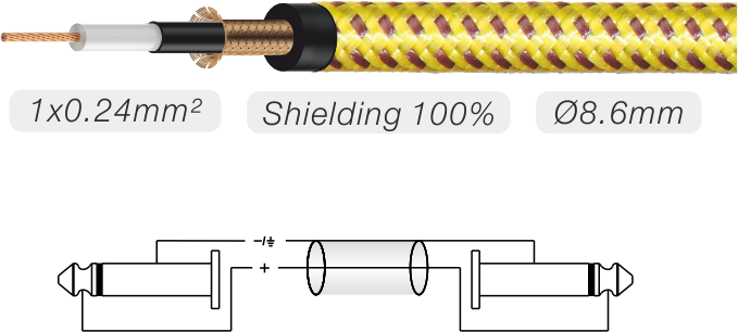 Right angle 6.3mm mono plug < - > 6.3mm mono plug Connectors: RJ077M and RJ076M Cable: GC040V