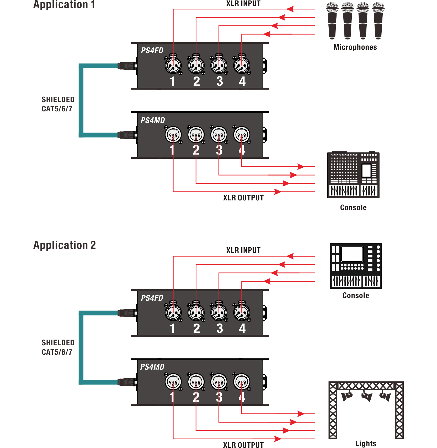 • Used to connect a single shielded CAT5,5E,6,6A or 7 cable to transmit and receive multiple lighting consoles, microphones, musical instrument, speakers, and other audio signals for the compact convenience of transmitting multi-channel digital signals or analogue balanced signals.