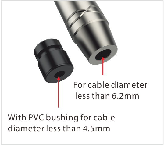 • Installing PVC bushing can be used for cable diameter less than 4.5mm. Removing PVC bushing can be used for cable diameter less than 6.2mm